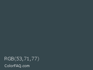RGB 53,71,77 Color is a dark blue color and the nearest color is Charcoal #36454f. Hex code #35474d and RGB value is rgb(53,71,77). In RGB color space, this color is composed of 21% red, 28% green, 30% blue, In CMYK color space, this color is composed of 31% cyan, 8% magenta, 0% yellow , 70% black , In HSL color space, this color has a hue angle of 195° , 18% saturation and 25% lightness.