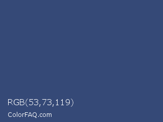 RGB 53,73,119 Color is a normal blue color and the nearest color is East Bay #414c7d. Hex code #354977 and RGB value is rgb(53,73,119). In RGB color space, this color is composed of 21% red, 29% green, 47% blue, In CMYK color space, this color is composed of 55% cyan, 39% magenta, 0% yellow , 53% black , In HSL color space, this color has a hue angle of 222° , 38% saturation and 34% lightness.