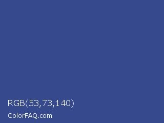 RGB 53,73,140 Color is a normal blue color and the nearest color is Chambray #354e8c. Hex code #35498c and RGB value is rgb(53,73,140). In RGB color space, this color is composed of 21% red, 29% green, 55% blue, In CMYK color space, this color is composed of 62% cyan, 48% magenta, 0% yellow , 45% black , In HSL color space, this color has a hue angle of 226° , 45% saturation and 38% lightness.