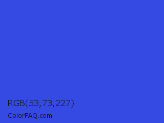 RGB 53,73,227 Color is a normal blue color and the nearest color is Palatinate Blue #273be2. Hex code #3549e3 and RGB value is rgb(53,73,227). In RGB color space, this color is composed of 21% red, 29% green, 89% blue, In CMYK color space, this color is composed of 77% cyan, 68% magenta, 0% yellow , 11% black , In HSL color space, this color has a hue angle of 233° , 76% saturation and 55% lightness.