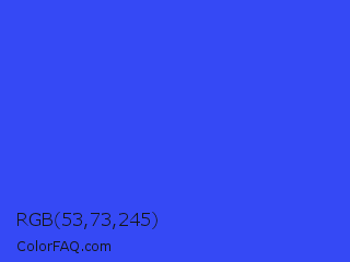 RGB 53,73,245 Color is a normal blue color and the nearest color is Palatinate Blue #273be2. Hex code #3549f5 and RGB value is rgb(53,73,245). In RGB color space, this color is composed of 21% red, 29% green, 96% blue, In CMYK color space, this color is composed of 78% cyan, 70% magenta, 0% yellow , 4% black , In HSL color space, this color has a hue angle of 234° , 91% saturation and 58% lightness.