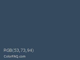 RGB 53,73,94 Color is a dark blue color and the nearest color is Pickled Bluewood #314459. Hex code #35495e and RGB value is rgb(53,73,94). In RGB color space, this color is composed of 21% red, 29% green, 37% blue, In CMYK color space, this color is composed of 44% cyan, 22% magenta, 0% yellow , 63% black , In HSL color space, this color has a hue angle of 211° , 28% saturation and 29% lightness.