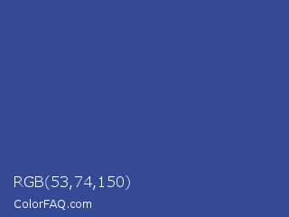 RGB 53,74,150 Color is a normal blue color and the nearest color is Chambray #354e8c. Hex code #354a96 and RGB value is rgb(53,74,150). In RGB color space, this color is composed of 21% red, 29% green, 59% blue, In CMYK color space, this color is composed of 65% cyan, 51% magenta, 0% yellow , 41% black , In HSL color space, this color has a hue angle of 227° , 48% saturation and 40% lightness.