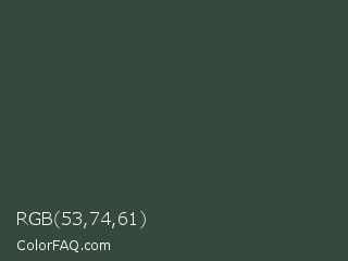 RGB 53,74,61 Color is a dark green color and the nearest color is Lunar Green #3c493a. Hex code #354a3d and RGB value is rgb(53,74,61). In RGB color space, this color is composed of 21% red, 29% green, 24% blue, In CMYK color space, this color is composed of 28% cyan, 0% magenta, 18% yellow , 71% black , In HSL color space, this color has a hue angle of 143° , 17% saturation and 25% lightness.