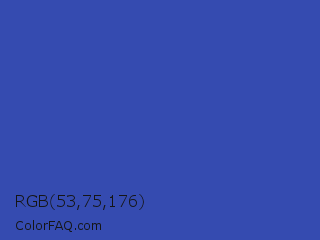 RGB 53,75,176 Color is a normal blue color and the nearest color is Violet Blue #324ab2. Hex code #354bb0 and RGB value is rgb(53,75,176). In RGB color space, this color is composed of 21% red, 29% green, 69% blue, In CMYK color space, this color is composed of 70% cyan, 57% magenta, 0% yellow , 31% black , In HSL color space, this color has a hue angle of 229° , 54% saturation and 45% lightness.