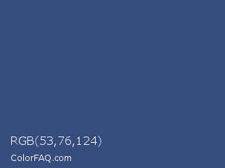 RGB 53,76,124 Color is a normal blue color and the nearest color is East Bay #414c7d. Hex code #354c7c and RGB value is rgb(53,76,124). In RGB color space, this color is composed of 21% red, 30% green, 49% blue, In CMYK color space, this color is composed of 57% cyan, 39% magenta, 0% yellow , 51% black , In HSL color space, this color has a hue angle of 221° , 40% saturation and 35% lightness.