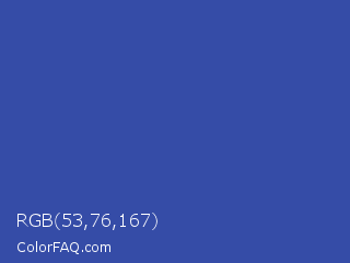 RGB 53,76,167 Color is a normal blue color and the nearest color is Violet Blue #324ab2. Hex code #354ca7 and RGB value is rgb(53,76,167). In RGB color space, this color is composed of 21% red, 30% green, 65% blue, In CMYK color space, this color is composed of 68% cyan, 54% magenta, 0% yellow , 35% black , In HSL color space, this color has a hue angle of 228° , 52% saturation and 43% lightness.