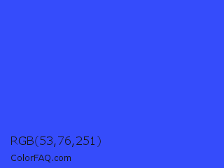 RGB 53,76,251 Color is a normal blue color and the nearest color is Ultramarine Blue #4166f5. Hex code #354cfb and RGB value is rgb(53,76,251). In RGB color space, this color is composed of 21% red, 30% green, 98% blue, In CMYK color space, this color is composed of 79% cyan, 70% magenta, 0% yellow , 2% black , In HSL color space, this color has a hue angle of 233° , 96% saturation and 60% lightness.