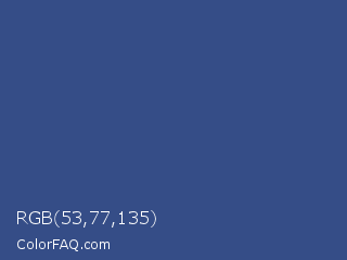 RGB 53,77,135 Color is a normal blue color and the nearest color is Chambray #354e8c. Hex code #354d87 and RGB value is rgb(53,77,135). In RGB color space, this color is composed of 21% red, 30% green, 53% blue, In CMYK color space, this color is composed of 61% cyan, 43% magenta, 0% yellow , 47% black , In HSL color space, this color has a hue angle of 222° , 44% saturation and 37% lightness.