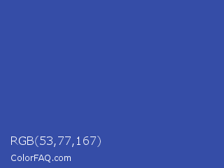 RGB 53,77,167 Color is a normal blue color and the nearest color is Sapphire #2f519e. Hex code #354da7 and RGB value is rgb(53,77,167). In RGB color space, this color is composed of 21% red, 30% green, 65% blue, In CMYK color space, this color is composed of 68% cyan, 54% magenta, 0% yellow , 35% black , In HSL color space, this color has a hue angle of 227° , 52% saturation and 43% lightness.