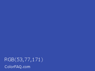 RGB 53,77,171 Color is a normal blue color and the nearest color is Violet Blue #324ab2. Hex code #354dab and RGB value is rgb(53,77,171). In RGB color space, this color is composed of 21% red, 30% green, 67% blue, In CMYK color space, this color is composed of 69% cyan, 55% magenta, 0% yellow , 33% black , In HSL color space, this color has a hue angle of 228° , 53% saturation and 44% lightness.