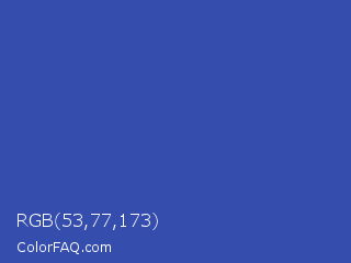 RGB 53,77,173 Color is a normal blue color and the nearest color is Violet Blue #324ab2. Hex code #354dad and RGB value is rgb(53,77,173). In RGB color space, this color is composed of 21% red, 30% green, 68% blue, In CMYK color space, this color is composed of 69% cyan, 55% magenta, 0% yellow , 32% black , In HSL color space, this color has a hue angle of 228° , 53% saturation and 44% lightness.