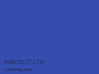 RGB 53,77,174 Color is a normal blue color and the nearest color is Violet Blue #324ab2. Hex code #354dae and RGB value is rgb(53,77,174). In RGB color space, this color is composed of 21% red, 30% green, 68% blue, In CMYK color space, this color is composed of 70% cyan, 56% magenta, 0% yellow , 32% black , In HSL color space, this color has a hue angle of 228° , 53% saturation and 45% lightness.