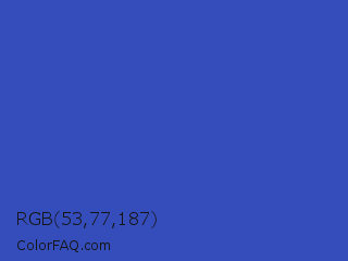 RGB 53,77,187 Color is a normal blue color and the nearest color is Violet Blue #324ab2. Hex code #354dbb and RGB value is rgb(53,77,187). In RGB color space, this color is composed of 21% red, 30% green, 73% blue, In CMYK color space, this color is composed of 72% cyan, 59% magenta, 0% yellow , 27% black , In HSL color space, this color has a hue angle of 229° , 56% saturation and 47% lightness.