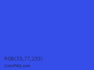 RGB 53,77,233 Color is a normal blue color and the nearest color is Palatinate Blue #273be2. Hex code #354de9 and RGB value is rgb(53,77,233). In RGB color space, this color is composed of 21% red, 30% green, 91% blue, In CMYK color space, this color is composed of 77% cyan, 67% magenta, 0% yellow , 9% black , In HSL color space, this color has a hue angle of 232° , 80% saturation and 56% lightness.