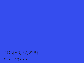 RGB 53,77,238 Color is a normal blue color and the nearest color is Palatinate Blue #273be2. Hex code #354dee and RGB value is rgb(53,77,238). In RGB color space, this color is composed of 21% red, 30% green, 93% blue, In CMYK color space, this color is composed of 78% cyan, 68% magenta, 0% yellow , 7% black , In HSL color space, this color has a hue angle of 232° , 84% saturation and 57% lightness.