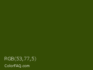 RGB 53,77,5 Color is a very dark green color and the nearest color is Clover #384910. Hex code #354d05 and RGB value is rgb(53,77,5). In RGB color space, this color is composed of 21% red, 30% green, 2% blue, In CMYK color space, this color is composed of 31% cyan, 0% magenta, 94% yellow , 70% black , In HSL color space, this color has a hue angle of 80° , 88% saturation and 16% lightness.