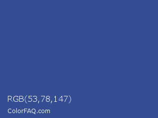RGB 53,78,147 Color is a normal blue color and the nearest color is Chambray #354e8c. Hex code #354e93 and RGB value is rgb(53,78,147). In RGB color space, this color is composed of 21% red, 31% green, 58% blue, In CMYK color space, this color is composed of 64% cyan, 47% magenta, 0% yellow , 42% black , In HSL color space, this color has a hue angle of 224° , 47% saturation and 39% lightness.