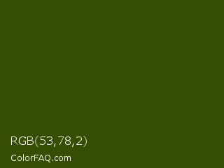 RGB 53,78,2 Color is a very dark green color and the nearest color is Clover #384910. Hex code #354e02 and RGB value is rgb(53,78,2). In RGB color space, this color is composed of 21% red, 31% green, 1% blue, In CMYK color space, this color is composed of 32% cyan, 0% magenta, 97% yellow , 69% black , In HSL color space, this color has a hue angle of 80° , 95% saturation and 16% lightness.