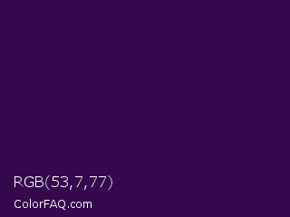 RGB 53,7,77 Color is a very dark purple color and the nearest color is Jagger #350e57. Hex code #35074d and RGB value is rgb(53,7,77). In RGB color space, this color is composed of 21% red, 3% green, 30% blue, In CMYK color space, this color is composed of 31% cyan, 91% magenta, 0% yellow , 70% black , In HSL color space, this color has a hue angle of 279° , 83% saturation and 16% lightness.