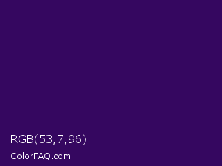 RGB 53,7,96 Color is a very dark purple color and the nearest color is Deep Violet #330066. Hex code #350760 and RGB value is rgb(53,7,96). In RGB color space, this color is composed of 21% red, 3% green, 38% blue, In CMYK color space, this color is composed of 45% cyan, 93% magenta, 0% yellow , 62% black , In HSL color space, this color has a hue angle of 271° , 86% saturation and 20% lightness.