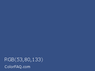 RGB 53,80,133 Color is a normal blue color and the nearest color is Chambray #354e8c. Hex code #355085 and RGB value is rgb(53,80,133). In RGB color space, this color is composed of 21% red, 31% green, 52% blue, In CMYK color space, this color is composed of 60% cyan, 40% magenta, 0% yellow , 48% black , In HSL color space, this color has a hue angle of 220° , 43% saturation and 36% lightness.