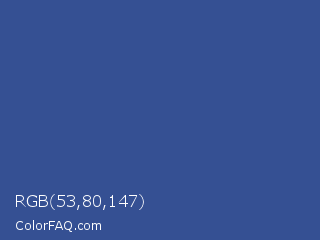 RGB 53,80,147 Color is a normal blue color and the nearest color is Chambray #354e8c. Hex code #355093 and RGB value is rgb(53,80,147). In RGB color space, this color is composed of 21% red, 31% green, 58% blue, In CMYK color space, this color is composed of 64% cyan, 46% magenta, 0% yellow , 42% black , In HSL color space, this color has a hue angle of 223° , 47% saturation and 39% lightness.