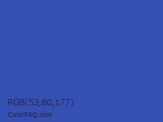 RGB 53,80,177 Color is a normal blue color and the nearest color is Violet Blue #324ab2. Hex code #3550b1 and RGB value is rgb(53,80,177). In RGB color space, this color is composed of 21% red, 31% green, 69% blue, In CMYK color space, this color is composed of 70% cyan, 55% magenta, 0% yellow , 31% black , In HSL color space, this color has a hue angle of 227° , 54% saturation and 45% lightness.