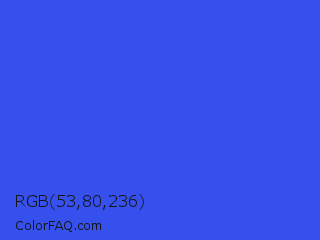 RGB 53,80,236 Color is a normal blue color and the nearest color is Ultramarine Blue #4166f5. Hex code #3550ec and RGB value is rgb(53,80,236). In RGB color space, this color is composed of 21% red, 31% green, 93% blue, In CMYK color space, this color is composed of 78% cyan, 66% magenta, 0% yellow , 7% black , In HSL color space, this color has a hue angle of 231° , 83% saturation and 57% lightness.