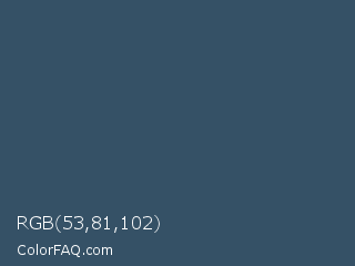 RGB 53,81,102 Color is a dark blue color and the nearest color is San Juan #304b6a. Hex code #355166 and RGB value is rgb(53,81,102). In RGB color space, this color is composed of 21% red, 32% green, 40% blue, In CMYK color space, this color is composed of 48% cyan, 21% magenta, 0% yellow , 60% black , In HSL color space, this color has a hue angle of 206° , 32% saturation and 30% lightness.