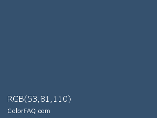 RGB 53,81,110 Color is a normal blue color and the nearest color is San Juan #304b6a. Hex code #35516e and RGB value is rgb(53,81,110). In RGB color space, this color is composed of 21% red, 32% green, 43% blue, In CMYK color space, this color is composed of 52% cyan, 26% magenta, 0% yellow , 57% black , In HSL color space, this color has a hue angle of 211° , 35% saturation and 32% lightness.