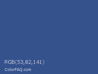 RGB 53,82,141 Color is a normal blue color and the nearest color is Chambray #354e8c. Hex code #35528d and RGB value is rgb(53,82,141). In RGB color space, this color is composed of 21% red, 32% green, 55% blue, In CMYK color space, this color is composed of 62% cyan, 42% magenta, 0% yellow , 45% black , In HSL color space, this color has a hue angle of 220° , 45% saturation and 38% lightness.