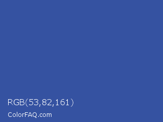 RGB 53,82,161 Color is a normal blue color and the nearest color is Sapphire #2f519e. Hex code #3552a1 and RGB value is rgb(53,82,161). In RGB color space, this color is composed of 21% red, 32% green, 63% blue, In CMYK color space, this color is composed of 67% cyan, 49% magenta, 0% yellow , 37% black , In HSL color space, this color has a hue angle of 224° , 50% saturation and 42% lightness.