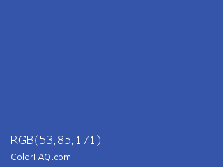 RGB 53,85,171 Color is a normal blue color and the nearest color is Azure #315ba1. Hex code #3555ab and RGB value is rgb(53,85,171). In RGB color space, this color is composed of 21% red, 33% green, 67% blue, In CMYK color space, this color is composed of 69% cyan, 50% magenta, 0% yellow , 33% black , In HSL color space, this color has a hue angle of 224° , 53% saturation and 44% lightness.
