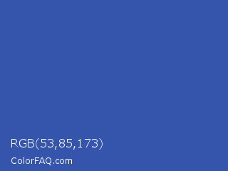 RGB 53,85,173 Color is a normal blue color and the nearest color is Violet Blue #324ab2. Hex code #3555ad and RGB value is rgb(53,85,173). In RGB color space, this color is composed of 21% red, 33% green, 68% blue, In CMYK color space, this color is composed of 69% cyan, 51% magenta, 0% yellow , 32% black , In HSL color space, this color has a hue angle of 224° , 53% saturation and 44% lightness.
