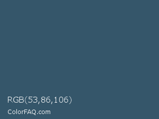RGB 53,86,106 Color is a normal blue color and the nearest color is San Juan #304b6a. Hex code #35566a and RGB value is rgb(53,86,106). In RGB color space, this color is composed of 21% red, 34% green, 42% blue, In CMYK color space, this color is composed of 50% cyan, 19% magenta, 0% yellow , 58% black , In HSL color space, this color has a hue angle of 203° , 33% saturation and 31% lightness.