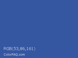 RGB 53,86,161 Color is a normal blue color and the nearest color is Azure #315ba1. Hex code #3556a1 and RGB value is rgb(53,86,161). In RGB color space, this color is composed of 21% red, 34% green, 63% blue, In CMYK color space, this color is composed of 67% cyan, 47% magenta, 0% yellow , 37% black , In HSL color space, this color has a hue angle of 222° , 50% saturation and 42% lightness.