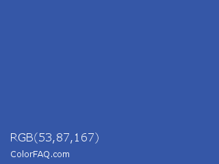 RGB 53,87,167 Color is a normal blue color and the nearest color is Azure #315ba1. Hex code #3557a7 and RGB value is rgb(53,87,167). In RGB color space, this color is composed of 21% red, 34% green, 65% blue, In CMYK color space, this color is composed of 68% cyan, 48% magenta, 0% yellow , 35% black , In HSL color space, this color has a hue angle of 222° , 52% saturation and 43% lightness.