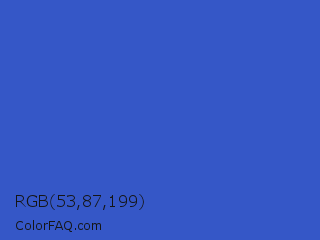 RGB 53,87,199 Color is a normal blue color and the nearest color is Cerulean Blue #2a52be. Hex code #3557c7 and RGB value is rgb(53,87,199). In RGB color space, this color is composed of 21% red, 34% green, 78% blue, In CMYK color space, this color is composed of 73% cyan, 56% magenta, 0% yellow , 22% black , In HSL color space, this color has a hue angle of 226° , 58% saturation and 49% lightness.