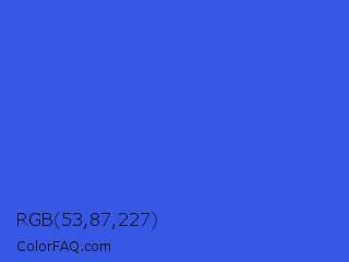 RGB 53,87,227 Color is a normal blue color and the nearest color is Royal Blue #4169e1. Hex code #3557e3 and RGB value is rgb(53,87,227). In RGB color space, this color is composed of 21% red, 34% green, 89% blue, In CMYK color space, this color is composed of 77% cyan, 62% magenta, 0% yellow , 11% black , In HSL color space, this color has a hue angle of 228° , 76% saturation and 55% lightness.