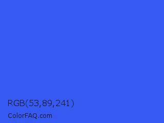 RGB 53,89,241 Color is a normal blue color and the nearest color is Ultramarine Blue #4166f5. Hex code #3559f1 and RGB value is rgb(53,89,241). In RGB color space, this color is composed of 21% red, 35% green, 95% blue, In CMYK color space, this color is composed of 78% cyan, 63% magenta, 0% yellow , 5% black , In HSL color space, this color has a hue angle of 229° , 87% saturation and 58% lightness.