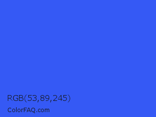 RGB 53,89,245 Color is a normal blue color and the nearest color is Ultramarine Blue #4166f5. Hex code #3559f5 and RGB value is rgb(53,89,245). In RGB color space, this color is composed of 21% red, 35% green, 96% blue, In CMYK color space, this color is composed of 78% cyan, 64% magenta, 0% yellow , 4% black , In HSL color space, this color has a hue angle of 229° , 91% saturation and 58% lightness.