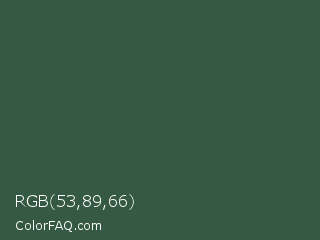 RGB 53,89,66 Color is a dark green color and the nearest color is Hunter Green #355e3b. Hex code #355942 and RGB value is rgb(53,89,66). In RGB color space, this color is composed of 21% red, 35% green, 26% blue, In CMYK color space, this color is composed of 40% cyan, 0% magenta, 26% yellow , 65% black , In HSL color space, this color has a hue angle of 142° , 25% saturation and 28% lightness.