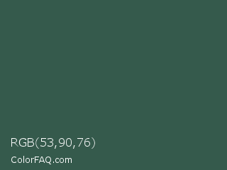 RGB 53,90,76 Color is a dark green color and the nearest color is Stromboli #325d52. Hex code #355a4c and RGB value is rgb(53,90,76). In RGB color space, this color is composed of 21% red, 35% green, 30% blue, In CMYK color space, this color is composed of 41% cyan, 0% magenta, 16% yellow , 65% black , In HSL color space, this color has a hue angle of 157° , 26% saturation and 28% lightness.