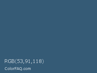 RGB 53,91,118 Color is a normal blue color and the nearest color is Casal #2f6168. Hex code #355b76 and RGB value is rgb(53,91,118). In RGB color space, this color is composed of 21% red, 36% green, 46% blue, In CMYK color space, this color is composed of 55% cyan, 23% magenta, 0% yellow , 54% black , In HSL color space, this color has a hue angle of 205° , 38% saturation and 34% lightness.