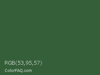 RGB 53,95,57 Color is a dark green color and the nearest color is Hunter Green #355e3b. Hex code #355f39 and RGB value is rgb(53,95,57). In RGB color space, this color is composed of 21% red, 37% green, 22% blue, In CMYK color space, this color is composed of 44% cyan, 0% magenta, 40% yellow , 63% black , In HSL color space, this color has a hue angle of 126° , 28% saturation and 29% lightness.