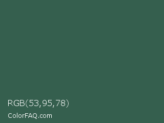 RGB 53,95,78 Color is a dark green color and the nearest color is Stromboli #325d52. Hex code #355f4e and RGB value is rgb(53,95,78). In RGB color space, this color is composed of 21% red, 37% green, 31% blue, In CMYK color space, this color is composed of 44% cyan, 0% magenta, 18% yellow , 63% black , In HSL color space, this color has a hue angle of 156° , 28% saturation and 29% lightness.