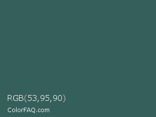RGB 53,95,90 Color is a dark cyan color and the nearest color is Spectra #2f5a57. Hex code #355f5a and RGB value is rgb(53,95,90). In RGB color space, this color is composed of 21% red, 37% green, 35% blue, In CMYK color space, this color is composed of 44% cyan, 0% magenta, 5% yellow , 63% black , In HSL color space, this color has a hue angle of 173° , 28% saturation and 29% lightness.