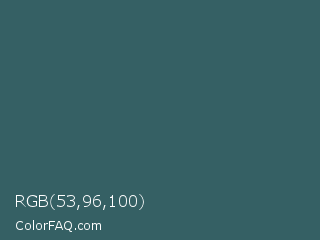 RGB 53,96,100 Color is a dark cyan color and the nearest color is Casal #2f6168. Hex code #356064 and RGB value is rgb(53,96,100). In RGB color space, this color is composed of 21% red, 38% green, 39% blue, In CMYK color space, this color is composed of 47% cyan, 4% magenta, 0% yellow , 61% black , In HSL color space, this color has a hue angle of 185° , 31% saturation and 30% lightness.