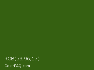 RGB 53,96,17 Color is a very dark green color and the nearest color is Dell #396413. Hex code #356011 and RGB value is rgb(53,96,17). In RGB color space, this color is composed of 21% red, 38% green, 7% blue, In CMYK color space, this color is composed of 45% cyan, 0% magenta, 82% yellow , 62% black , In HSL color space, this color has a hue angle of 93° , 70% saturation and 22% lightness.